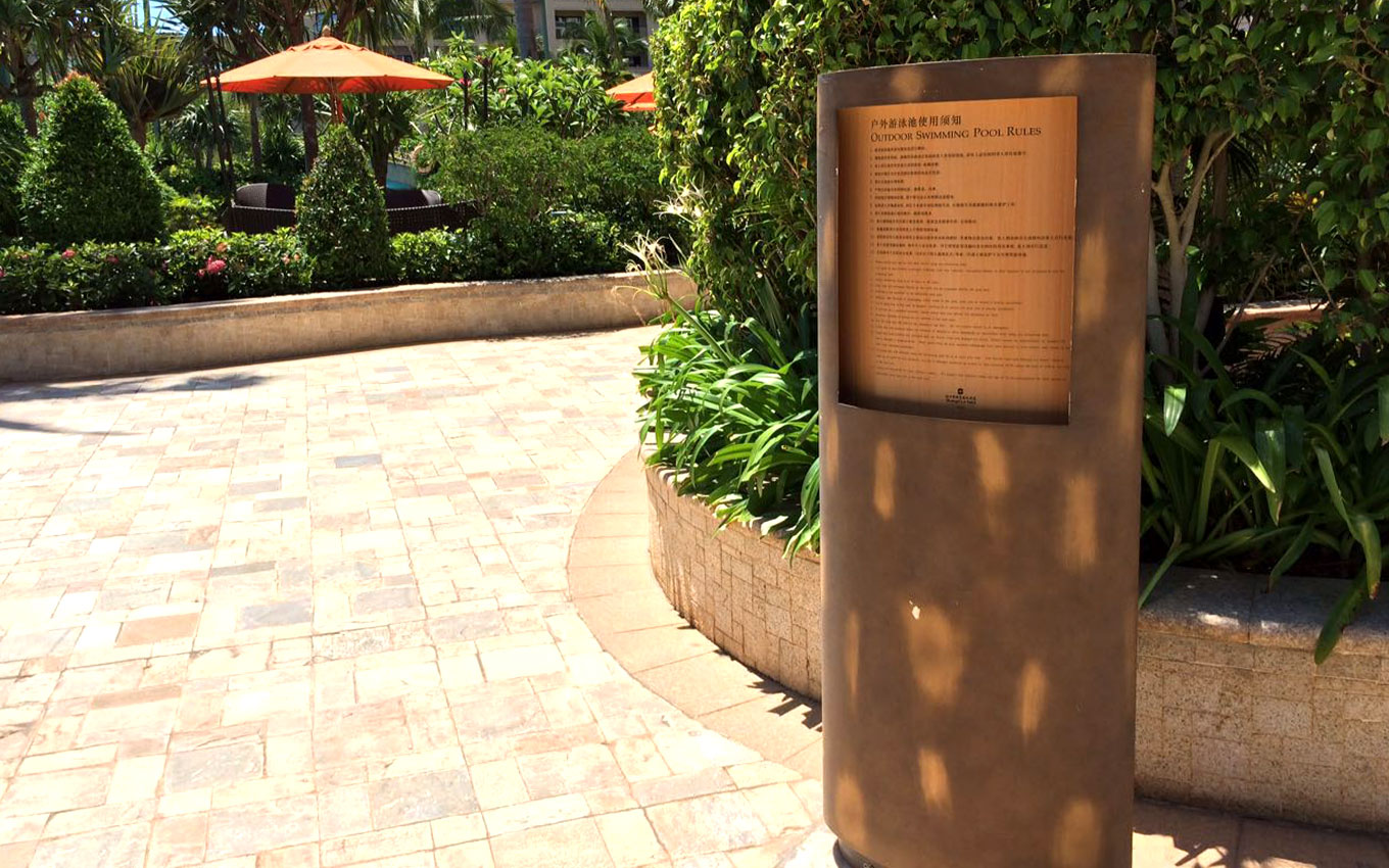 海口香格里拉大酒店位于海口市度假中心,海邊的天然美景、海岸線的風(fēng)光、椰風(fēng)的靜謐之處、這是海口度假天堂,海口香格里拉大酒店標(biāo)識設(shè)計(jì)以海洋、海口椰樹風(fēng)光為設(shè)計(jì)創(chuàng)意,室外以古銅打造陽光下的度假方案導(dǎo)視設(shè)計(jì),室內(nèi)以沙石雕花邊工藝制作,結(jié)合金屬質(zhì)感的點(diǎn)綴,形成鮮明的品質(zhì)感。